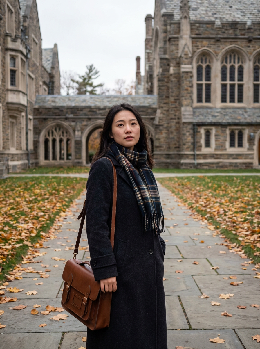 model at gothic university, dark academia fashion, wool coat, scarf, autumn leaves, old stone buildings