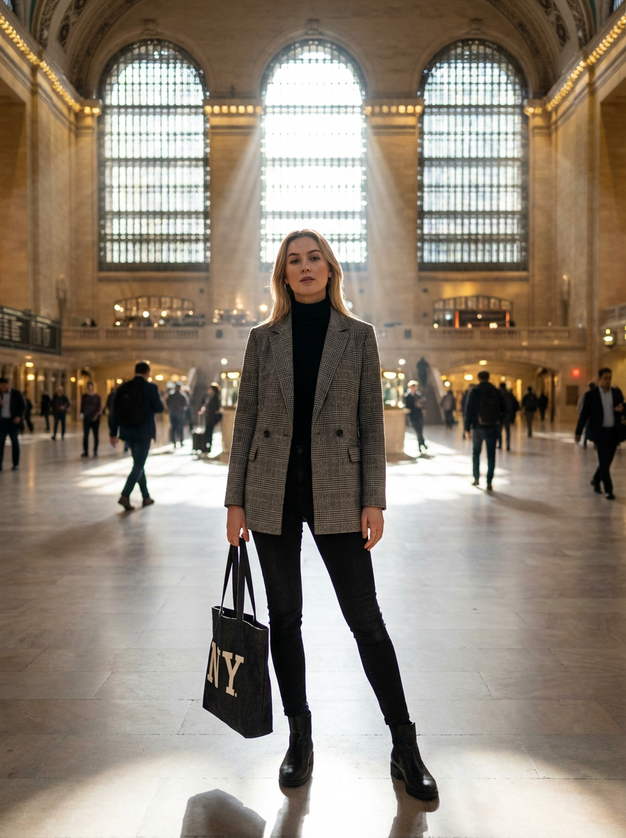model at Grand Central Terminal, main concourse, elegant travel outfit, dramatic light beams from windows