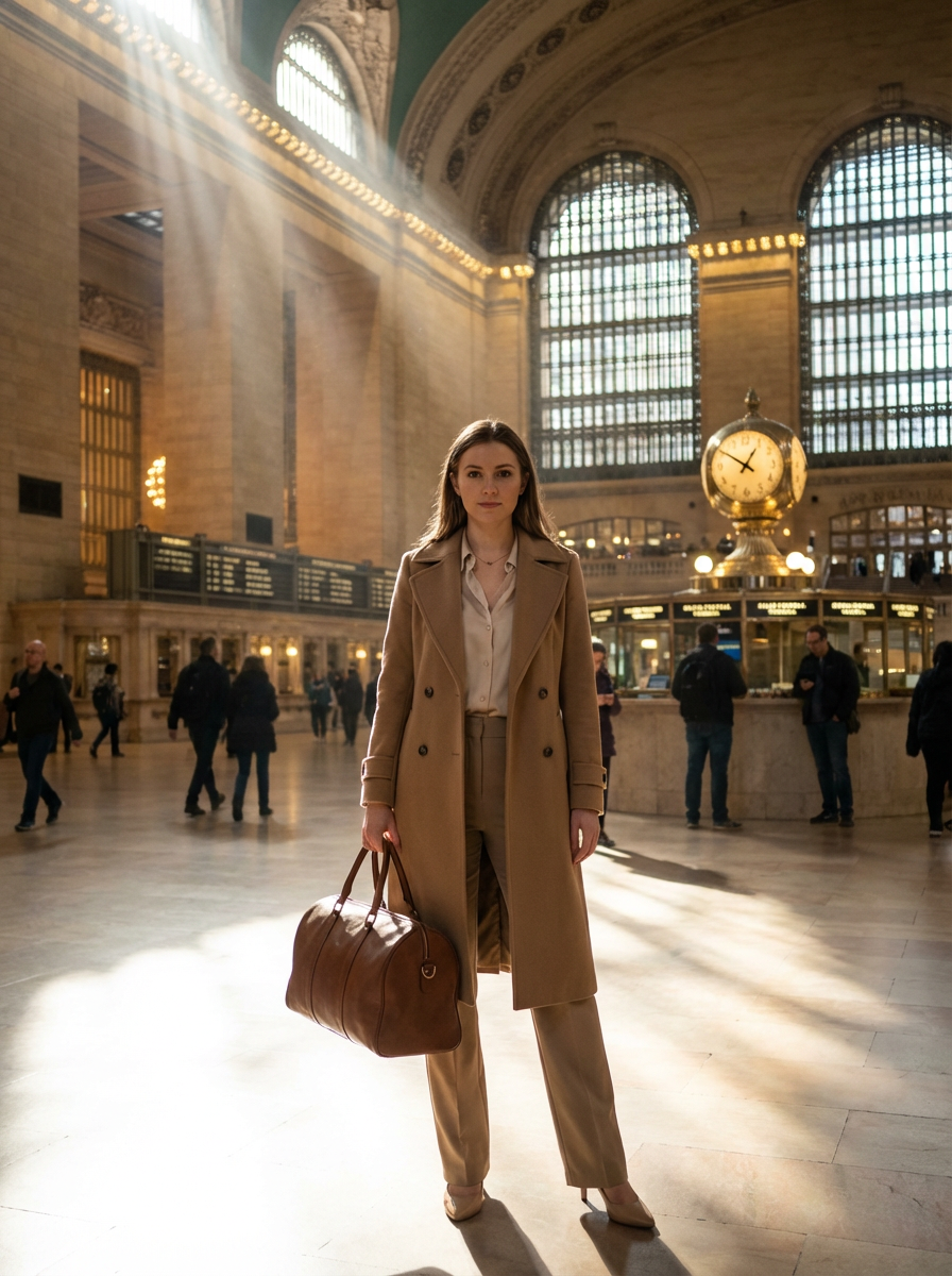 model at Grand Central Terminal, main concourse, elegant travel outfit, dramatic light beams from windows