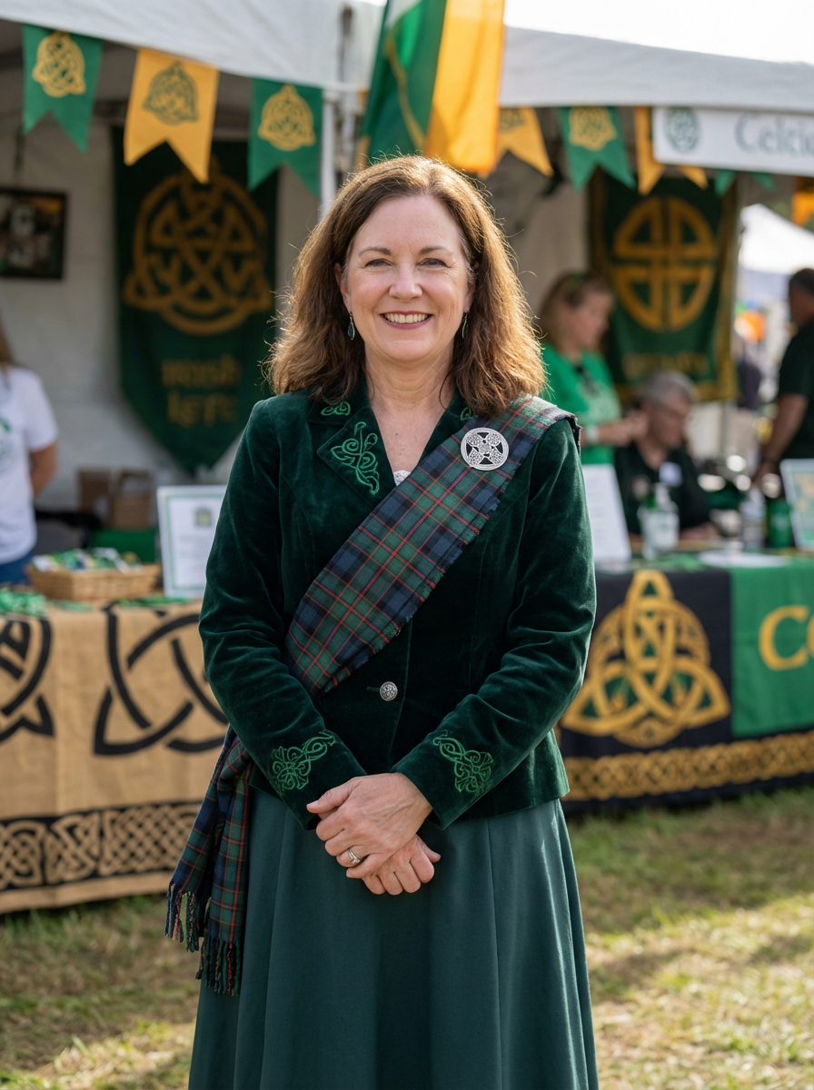 model at Irish heritage celebration, Celtic decorations, traditional and modern mix, proud festive look