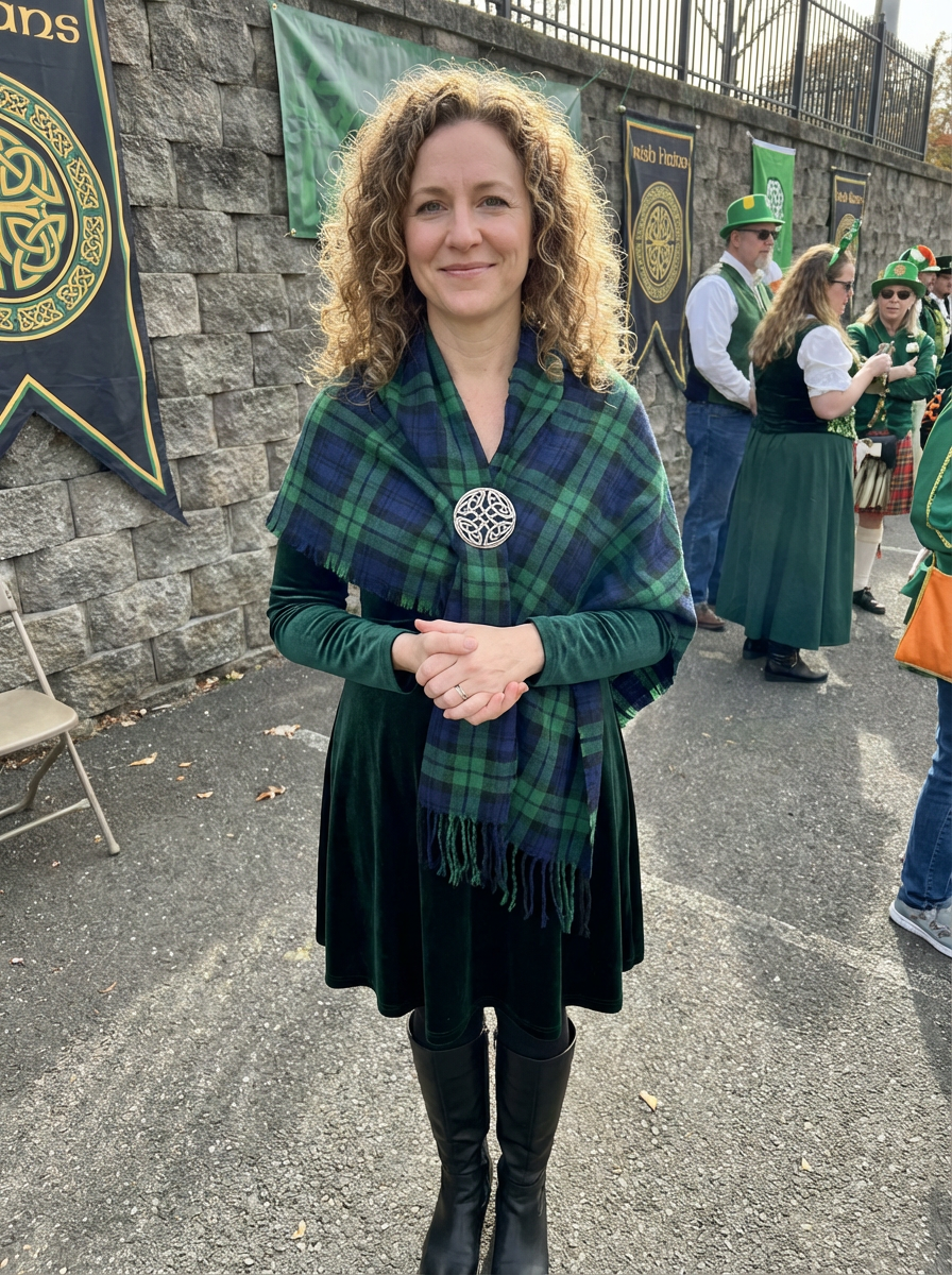 model at Irish heritage celebration, Celtic decorations, traditional and modern mix, proud festive look