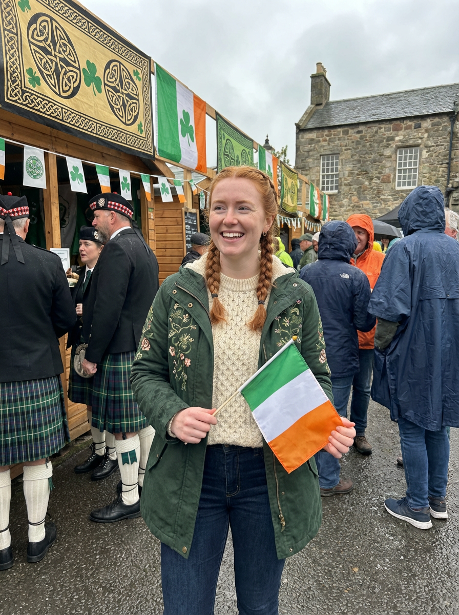 model at Irish heritage celebration, Celtic decorations, traditional and modern mix, proud festive look