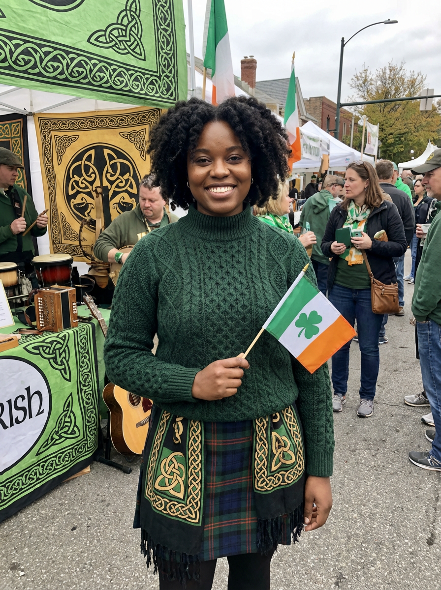 model at Irish heritage celebration, Celtic decorations, traditional and modern mix, proud festive look