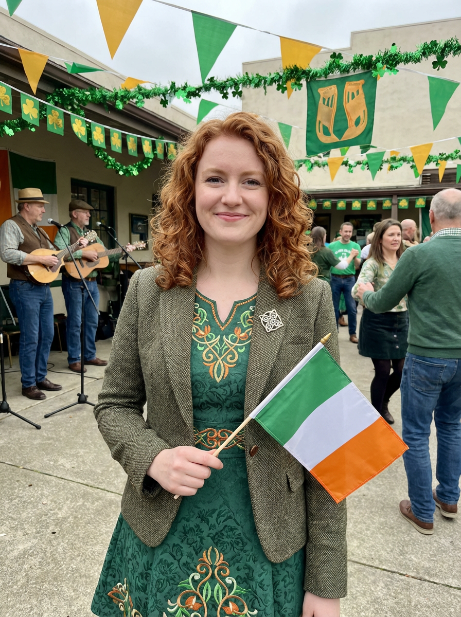 model at Irish heritage celebration, Celtic decorations, traditional and modern mix, proud festive look