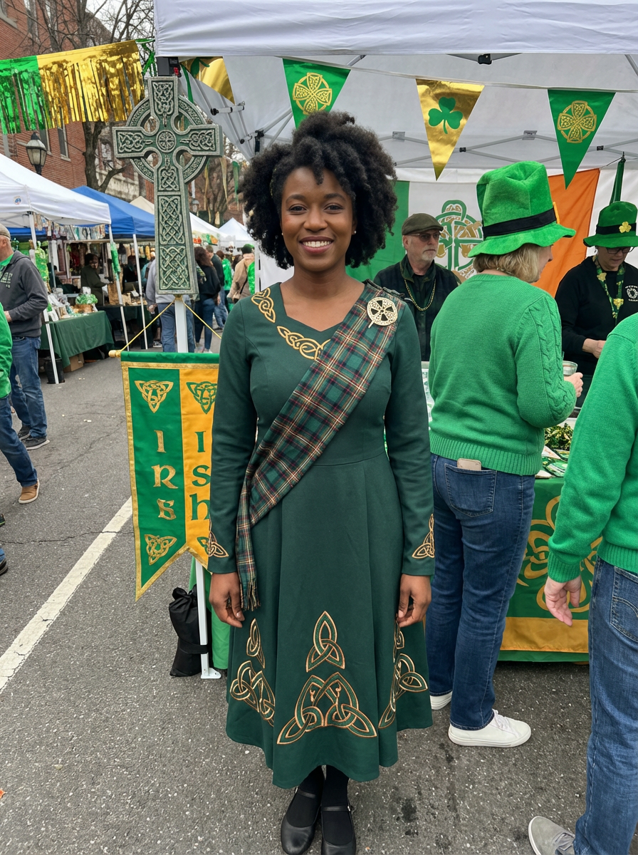 model at Irish heritage celebration, Celtic decorations, traditional and modern mix, proud festive look