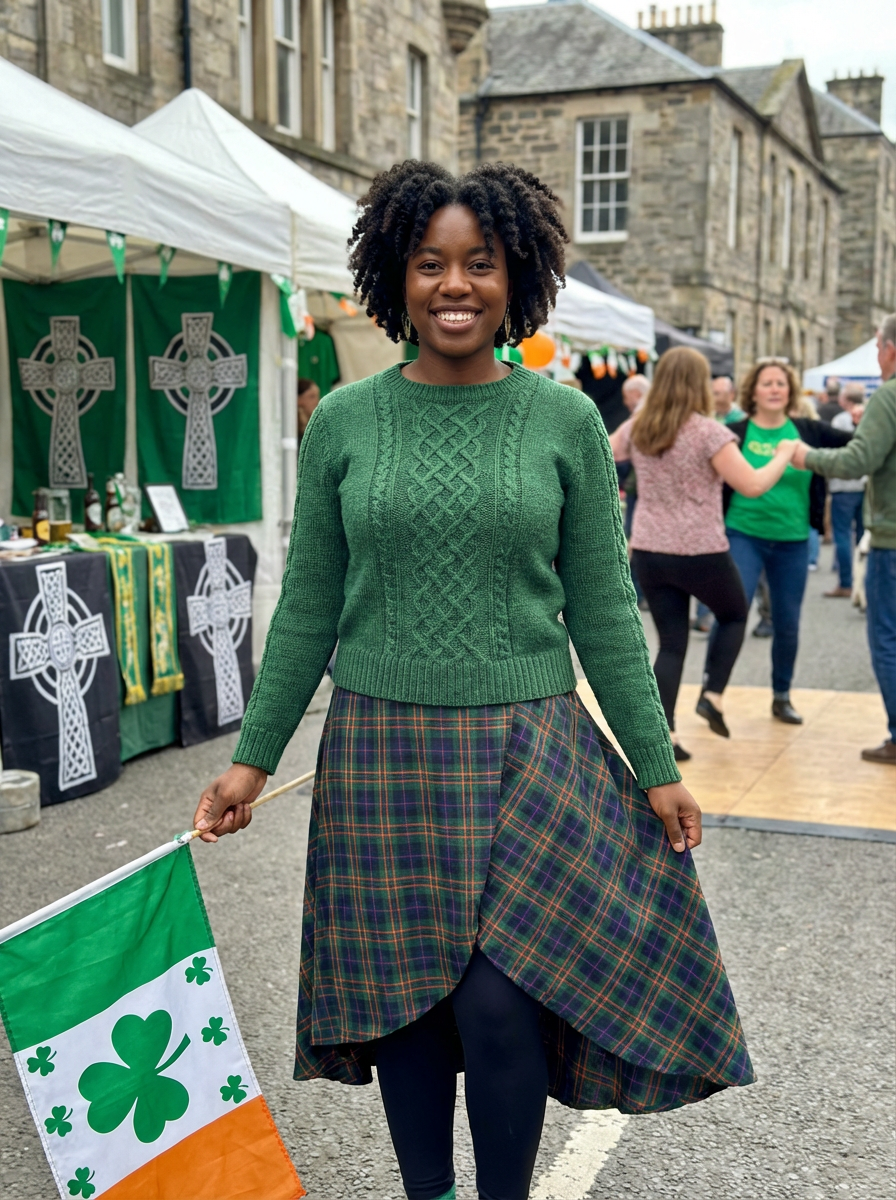 model at Irish heritage celebration, Celtic decorations, traditional and modern mix, proud festive look