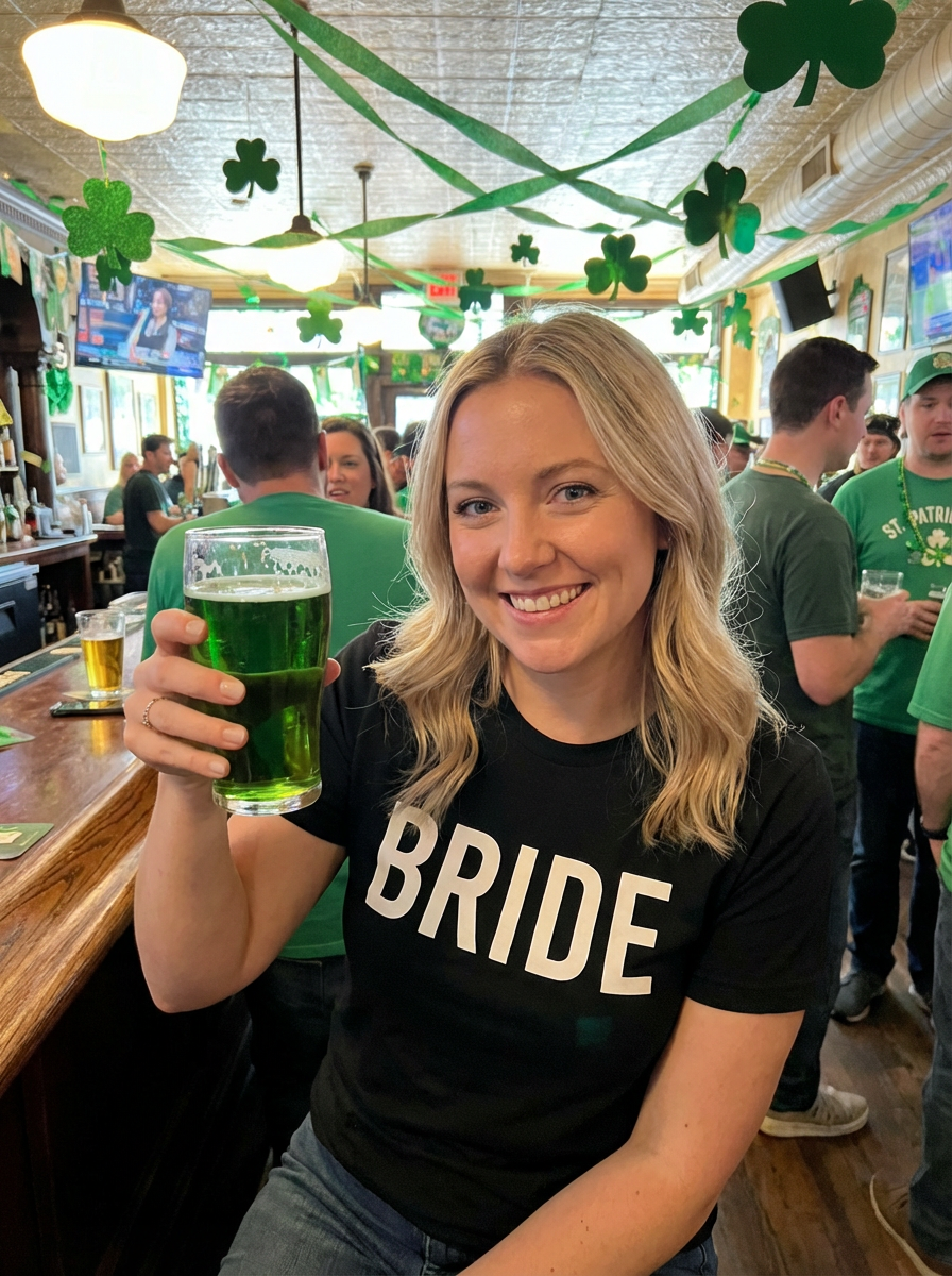 model at Irish pub, green beer, St Patricks Day decorations, pub atmosphere, cheerful toast