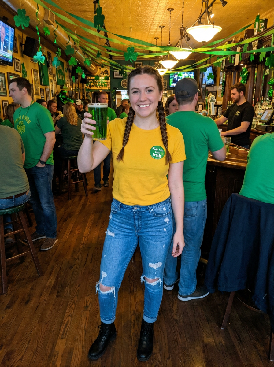 model at Irish pub, green beer, St Patricks Day decorations, pub atmosphere, cheerful toast