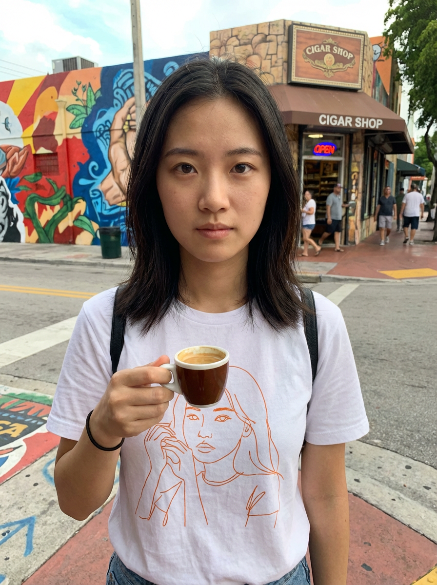 model at Little Havana, Calle Ocho, Cuban coffee in hand, colorful cultural setting