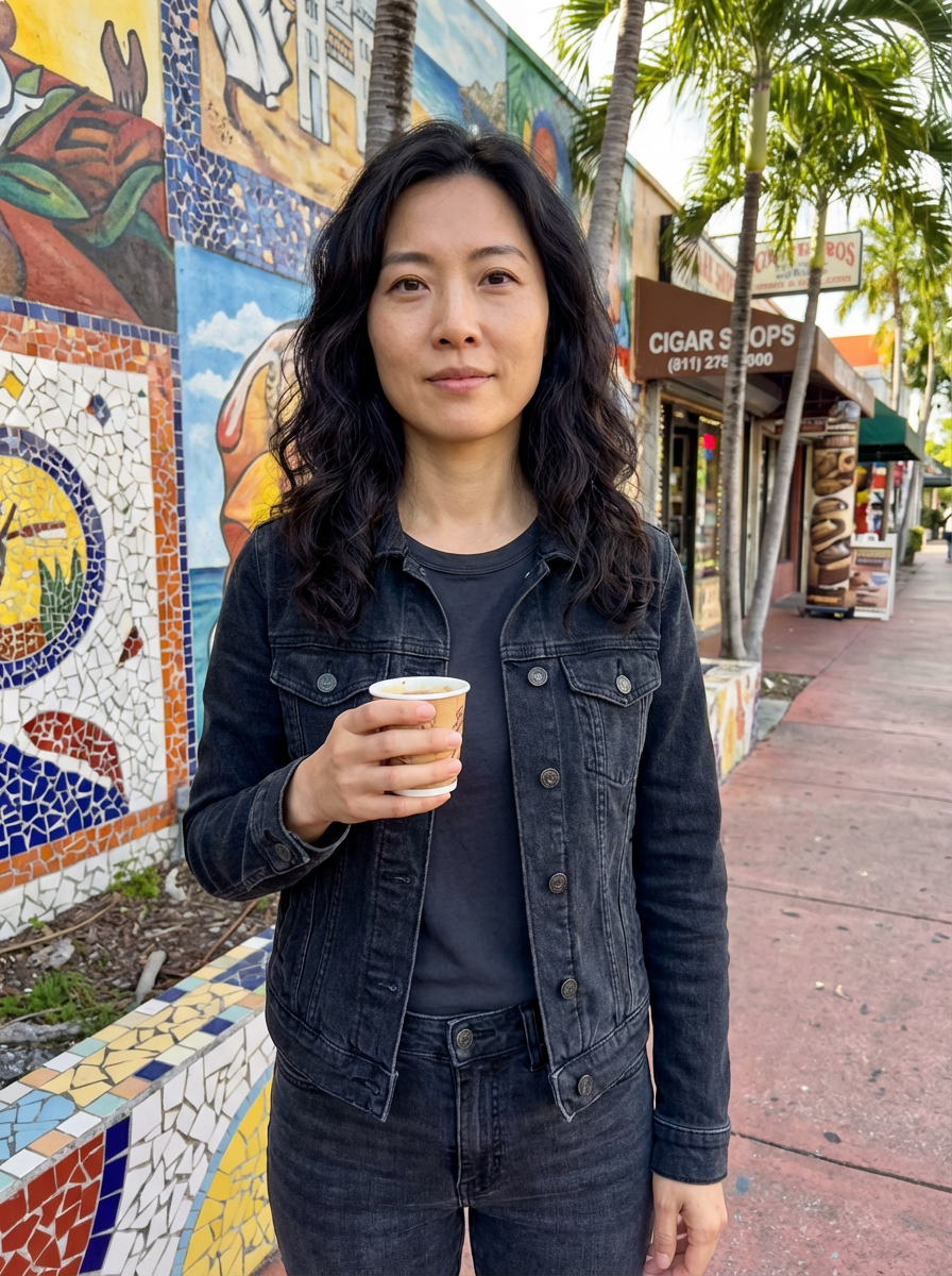 model at Little Havana, Calle Ocho, Cuban coffee in hand, colorful cultural setting