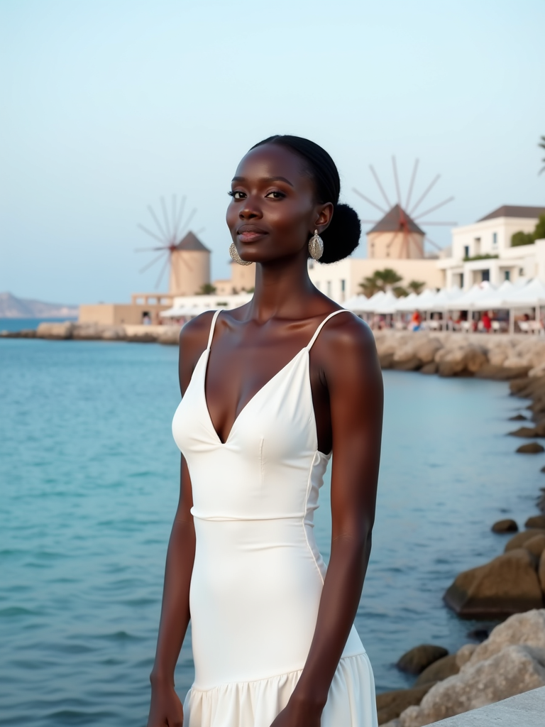 model at Little Venice waterfront, wearing an elegant white cocktail dress , Aegean Sea and windmills in background