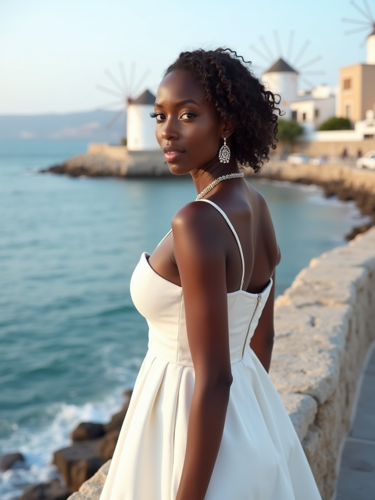 model at Little Venice waterfront, wearing an elegant white cocktail dress , Aegean Sea and windmills in background