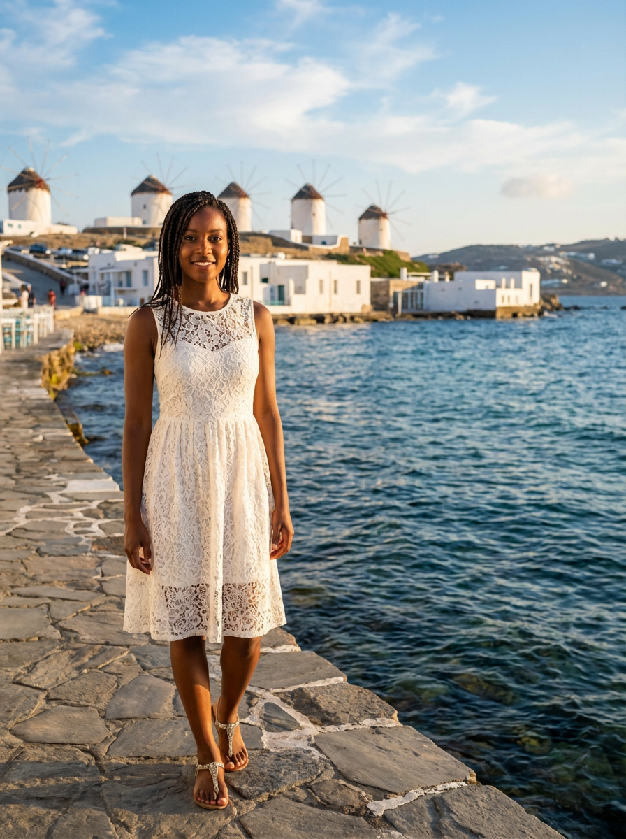 model at Little Venice waterfront, wearing an elegant white cocktail dress , Aegean Sea and windmills in background