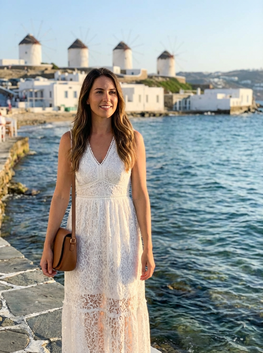 model at Little Venice waterfront, wearing an elegant white cocktail dress , Aegean Sea and windmills in background