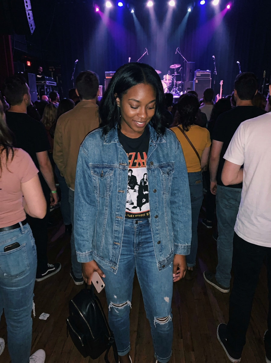 model at live music venue, music lover aesthetic, casual cool outfit, authentic atmosphere