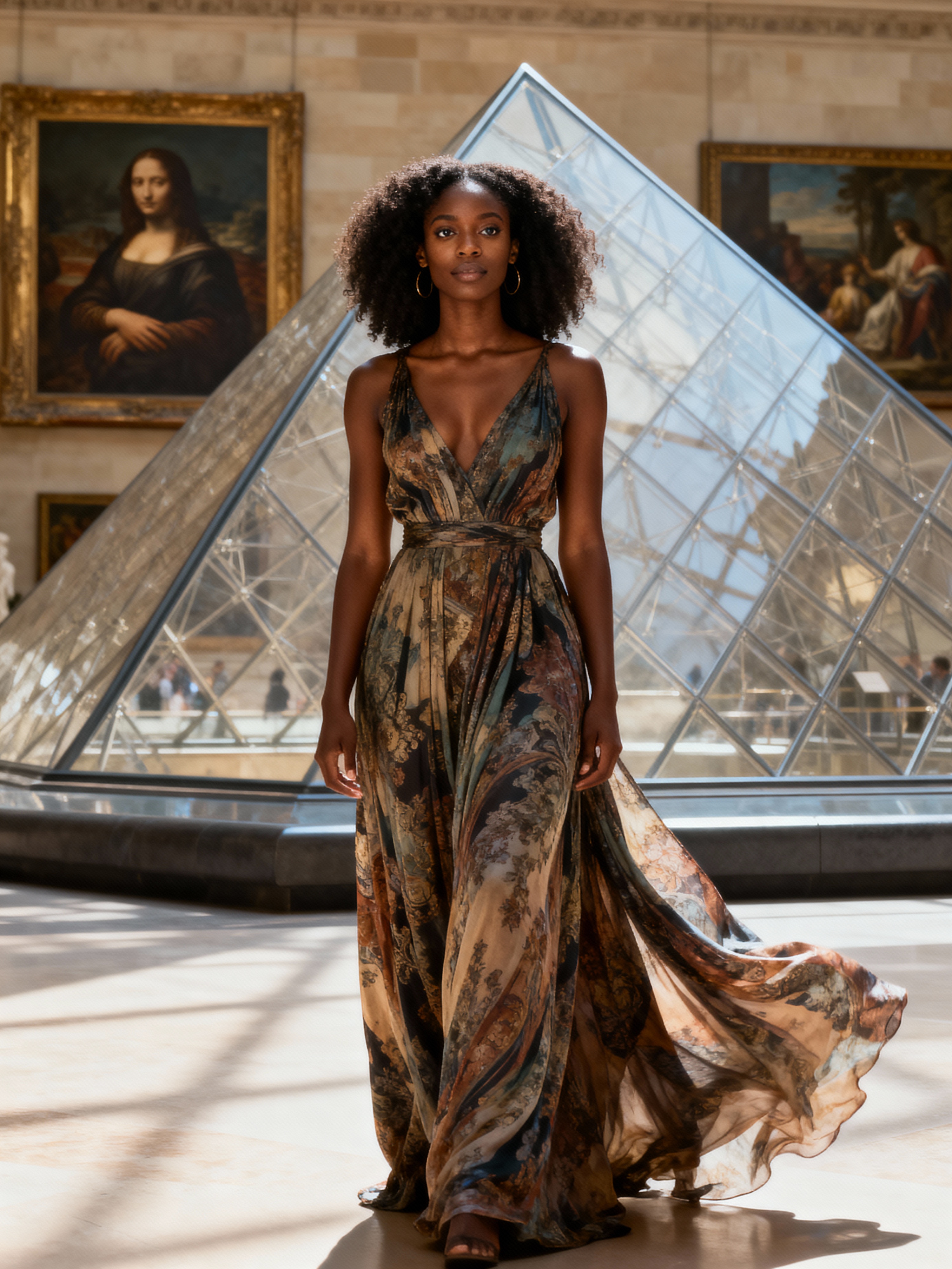 model at Louvre Museum, wearing a flowing maxi dress , surrounded by art masterpieces