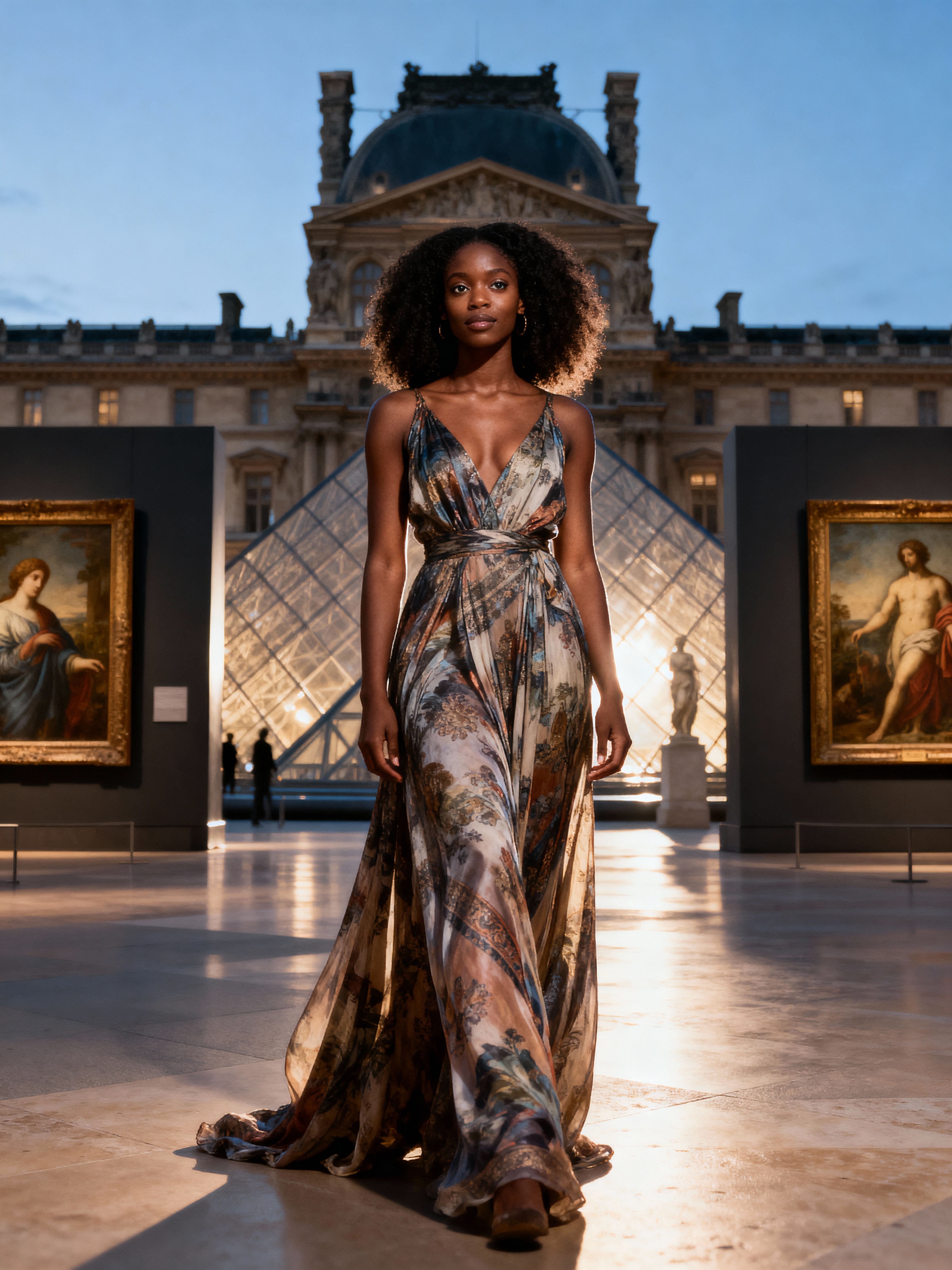 model at Louvre Museum, wearing a flowing maxi dress , surrounded by art masterpieces
