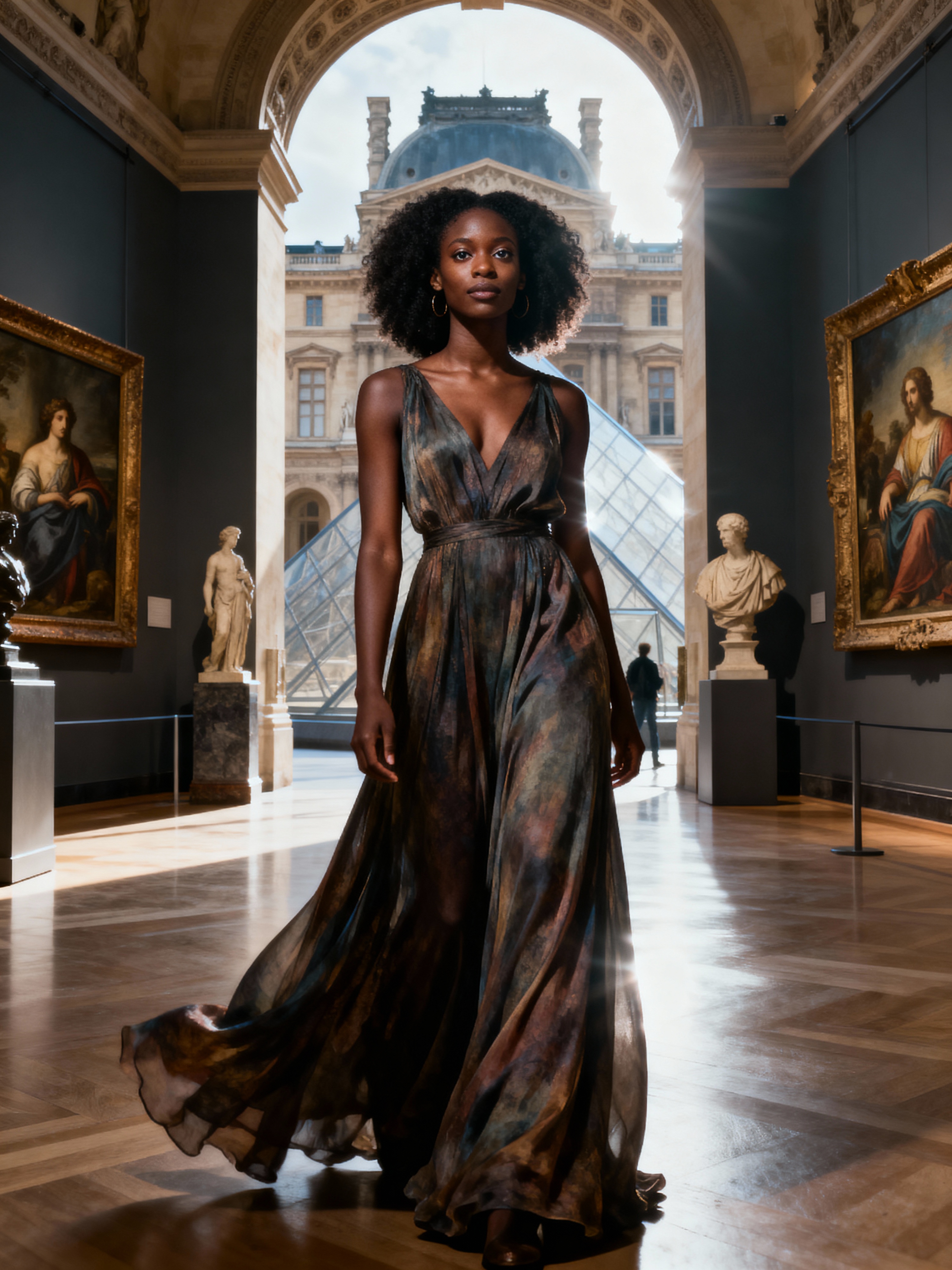 model at Louvre Museum, wearing a flowing maxi dress , surrounded by art masterpieces
