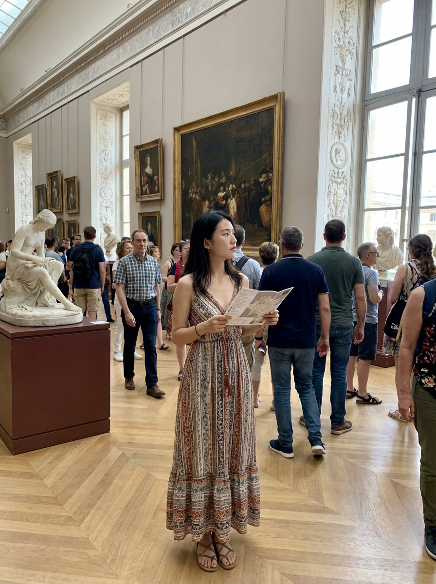 model at Louvre Museum, wearing a flowing maxi dress , surrounded by art masterpieces