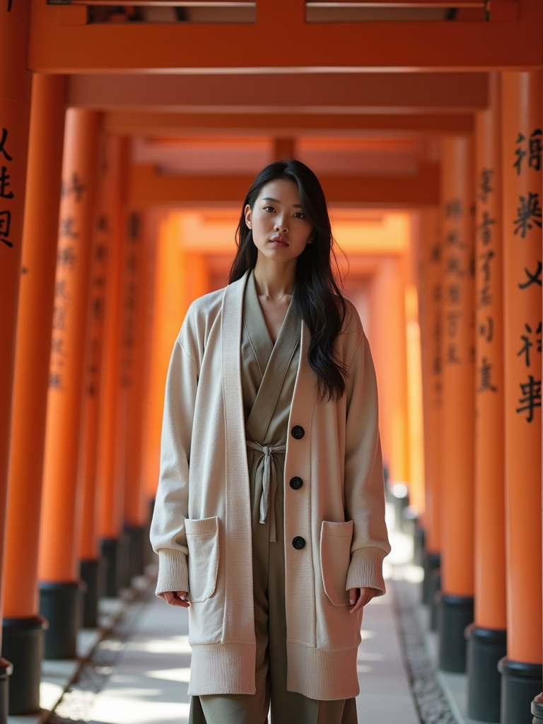 model at Meiji Shrine, wearing a respectful modest outfit with light cardigan , walking through torii gates