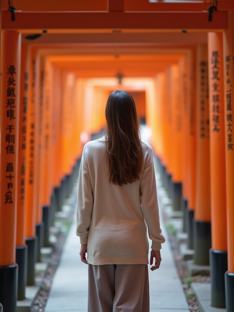 model at Meiji Shrine, wearing a respectful modest outfit with light cardigan , walking through torii gates