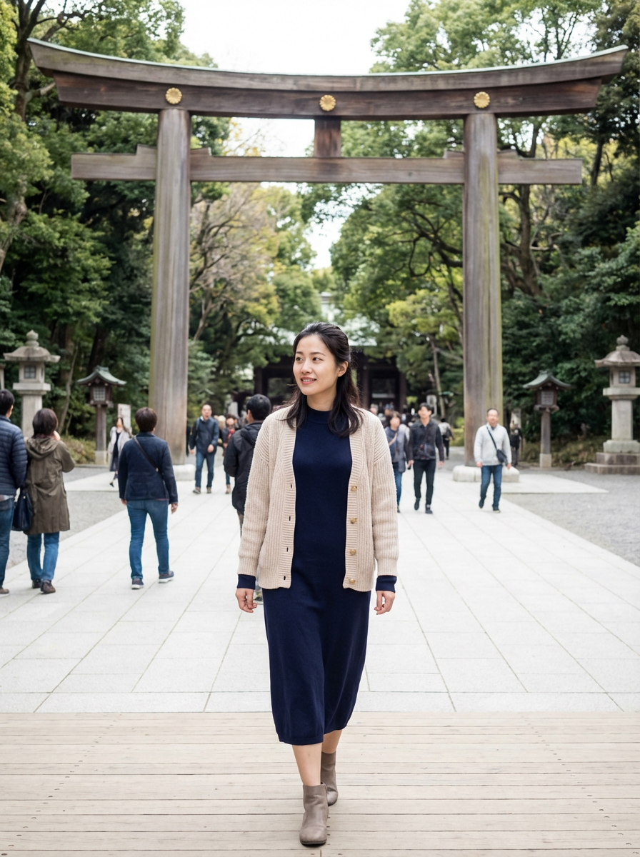 model at Meiji Shrine, wearing a respectful modest outfit with light cardigan , walking through torii gates