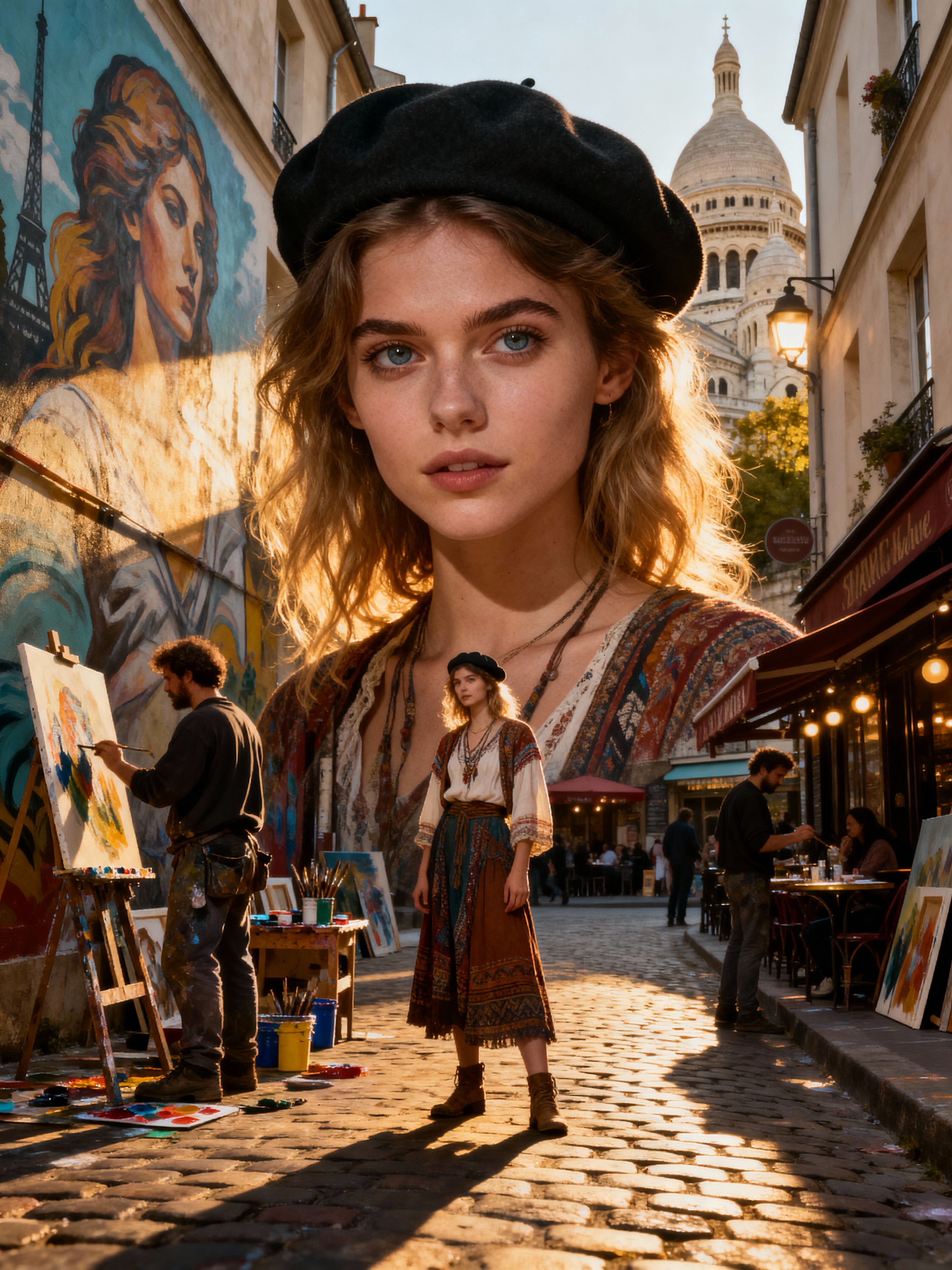 model at Montmartre art district, wearing bohemian-inspired fashion with beret , surrounded by street artists