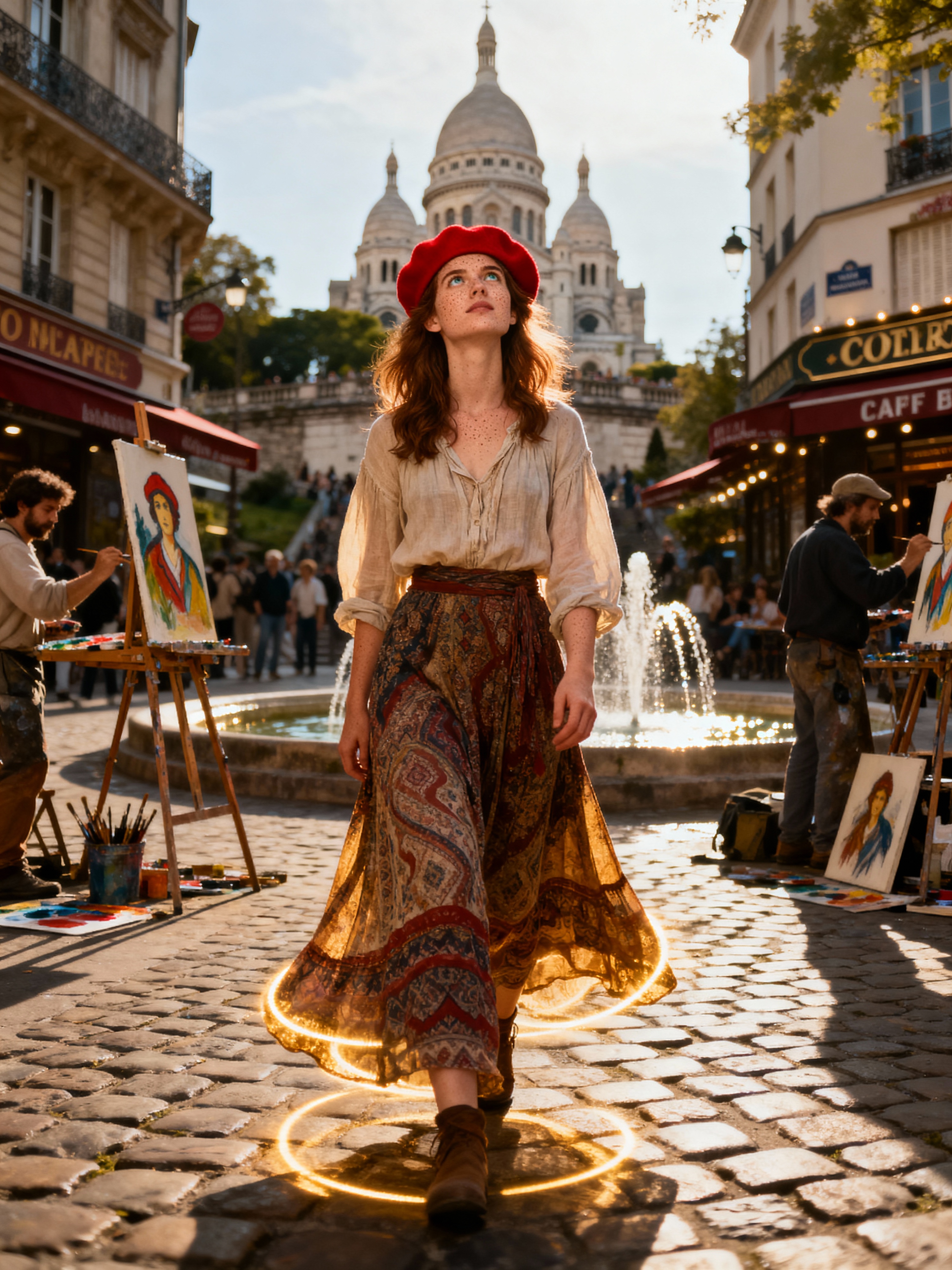 model at Montmartre art district, wearing bohemian-inspired fashion with beret , surrounded by street artists