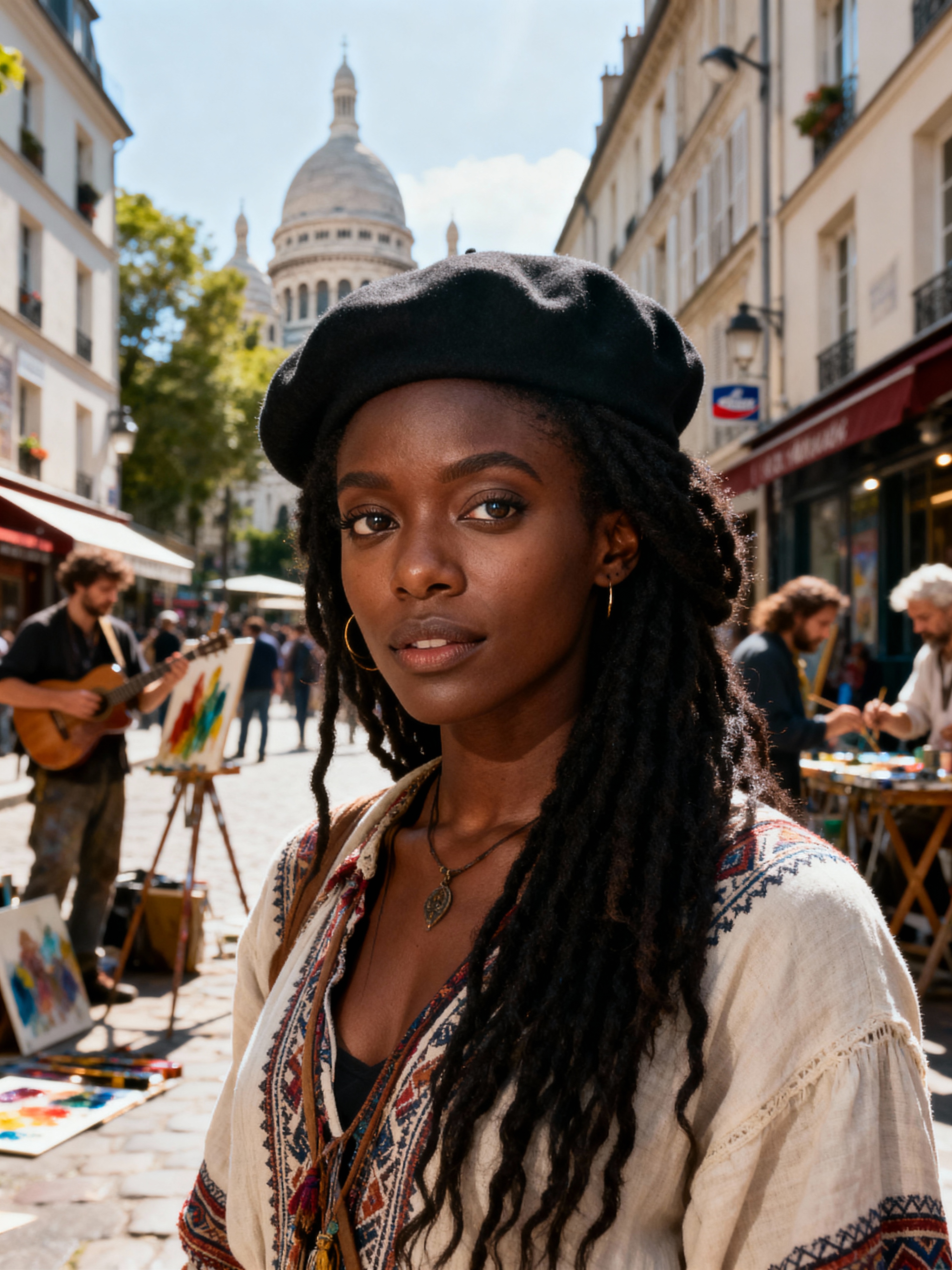 model at Montmartre art district, wearing bohemian-inspired fashion with beret , surrounded by street artists