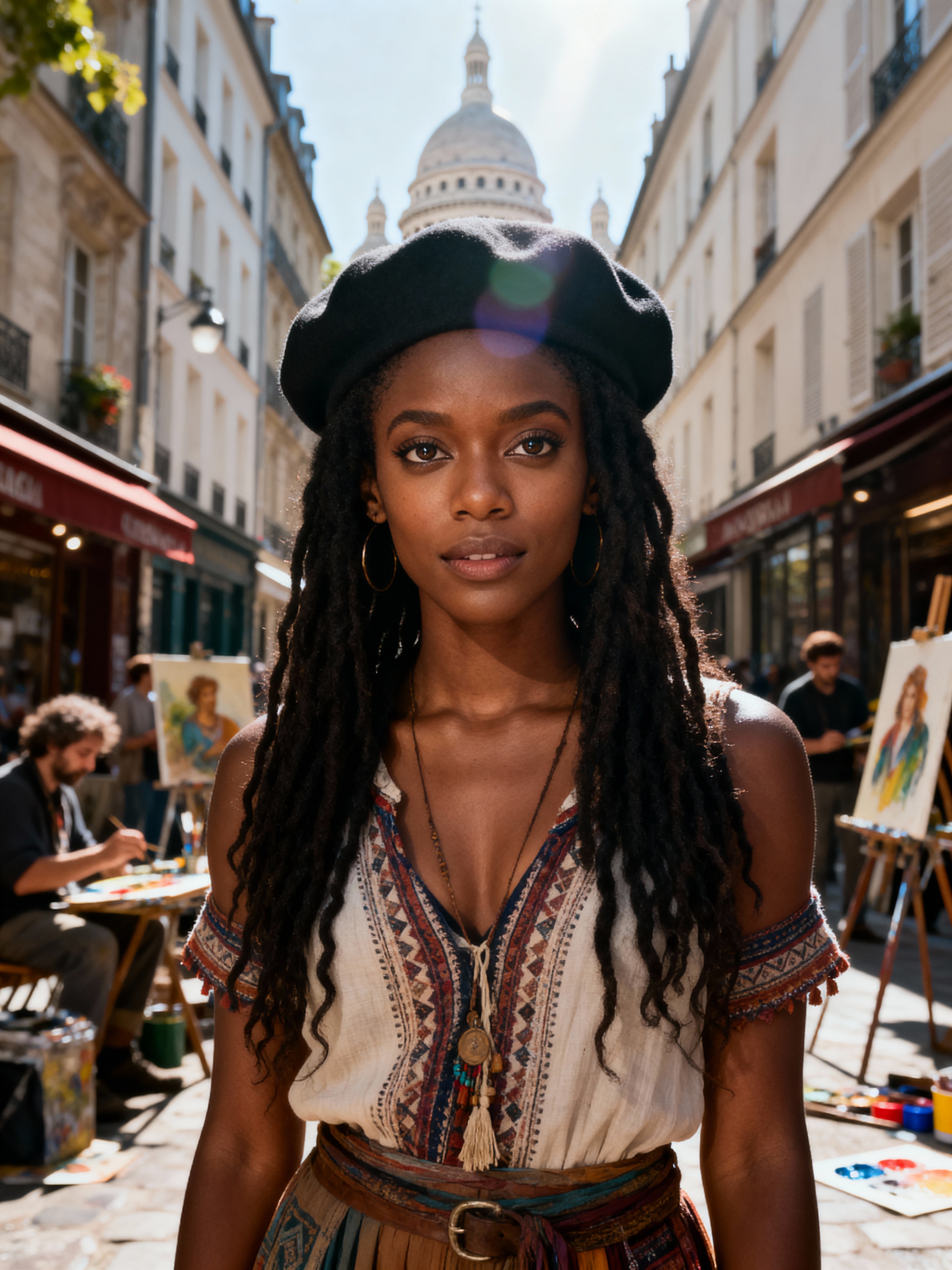 model at Montmartre art district, wearing bohemian-inspired fashion with beret , surrounded by street artists