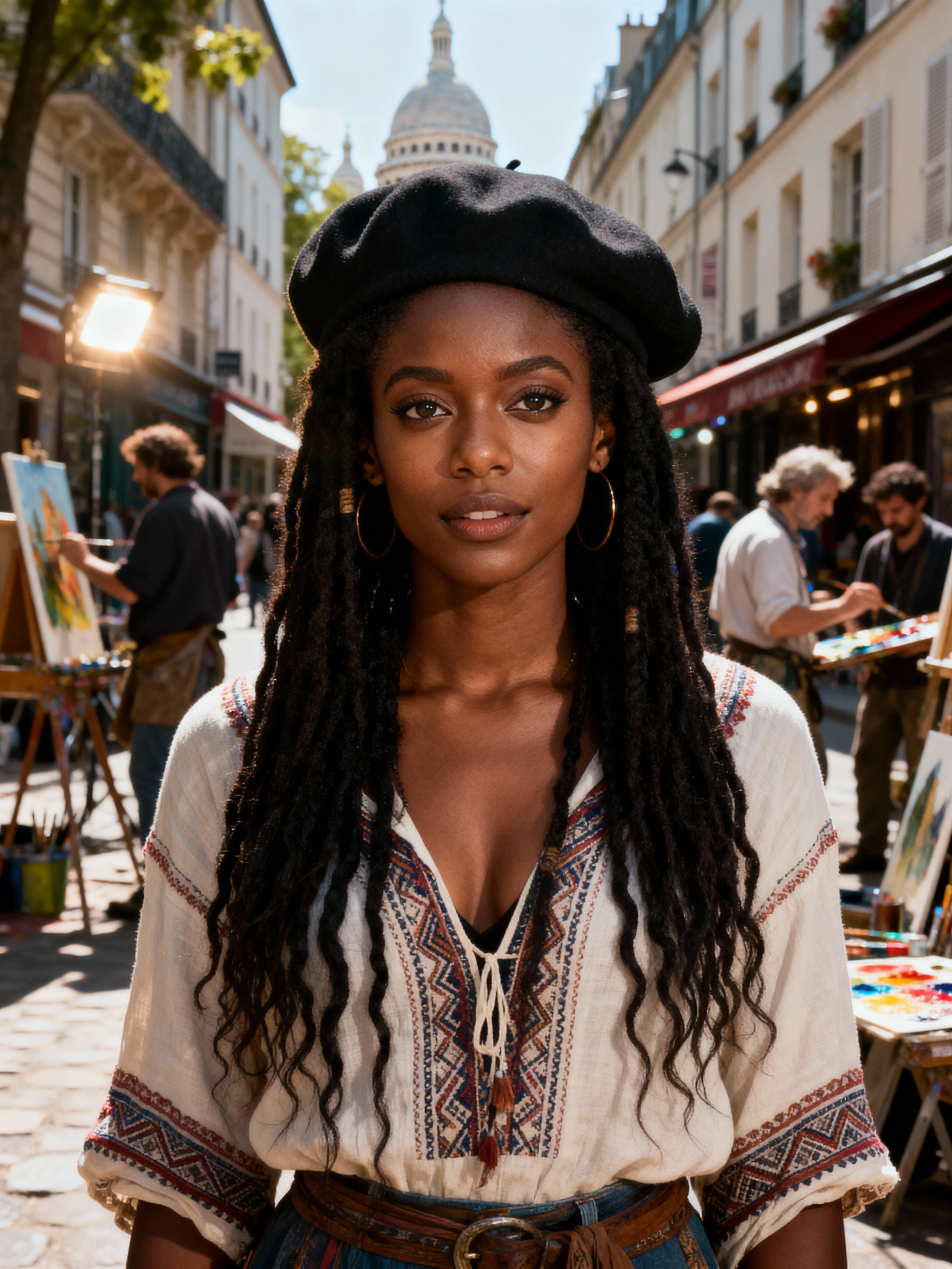 model at Montmartre art district, wearing bohemian-inspired fashion with beret , surrounded by street artists