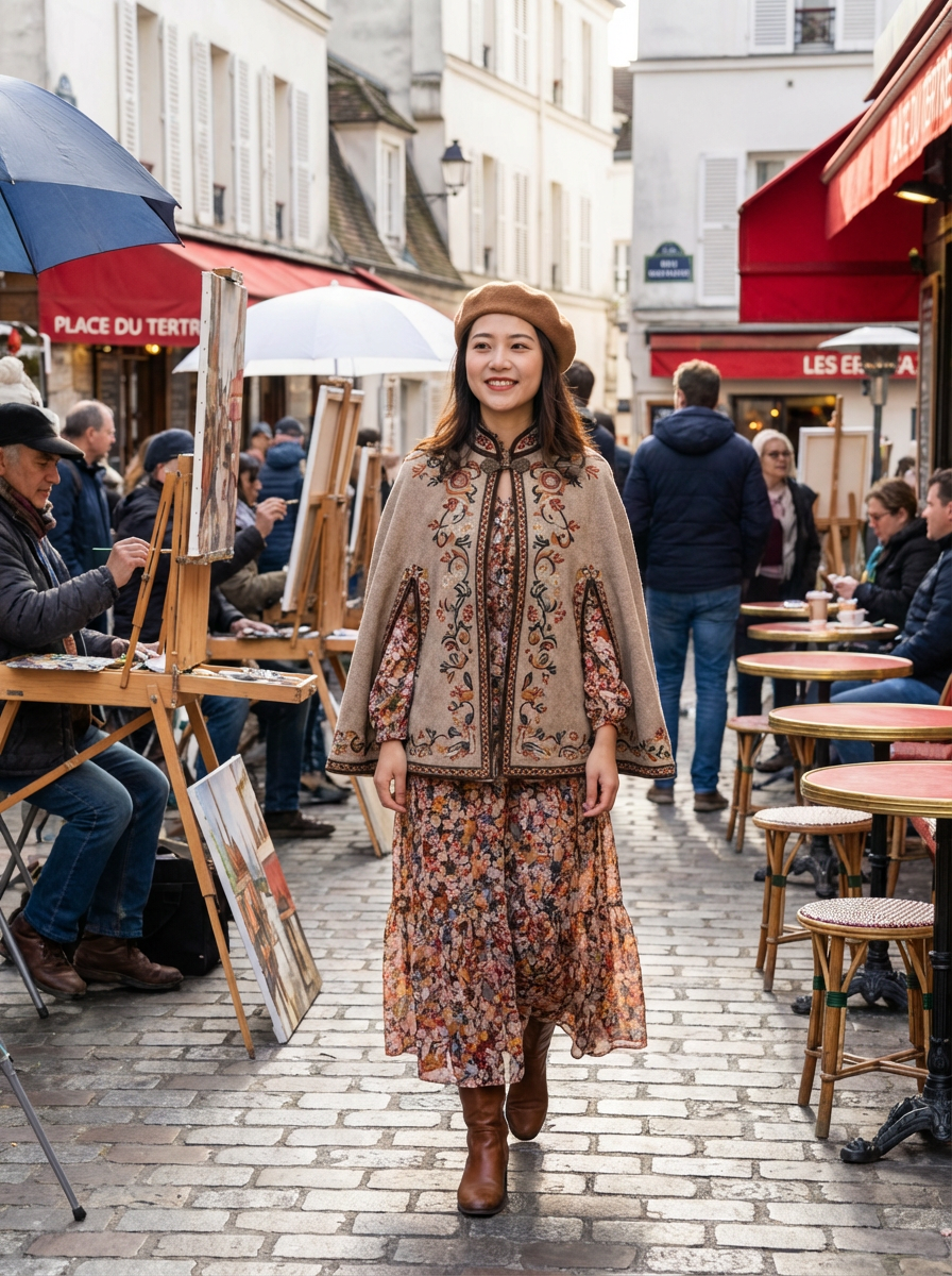 model at Montmartre art district, wearing bohemian-inspired fashion with beret , surrounded by street artists