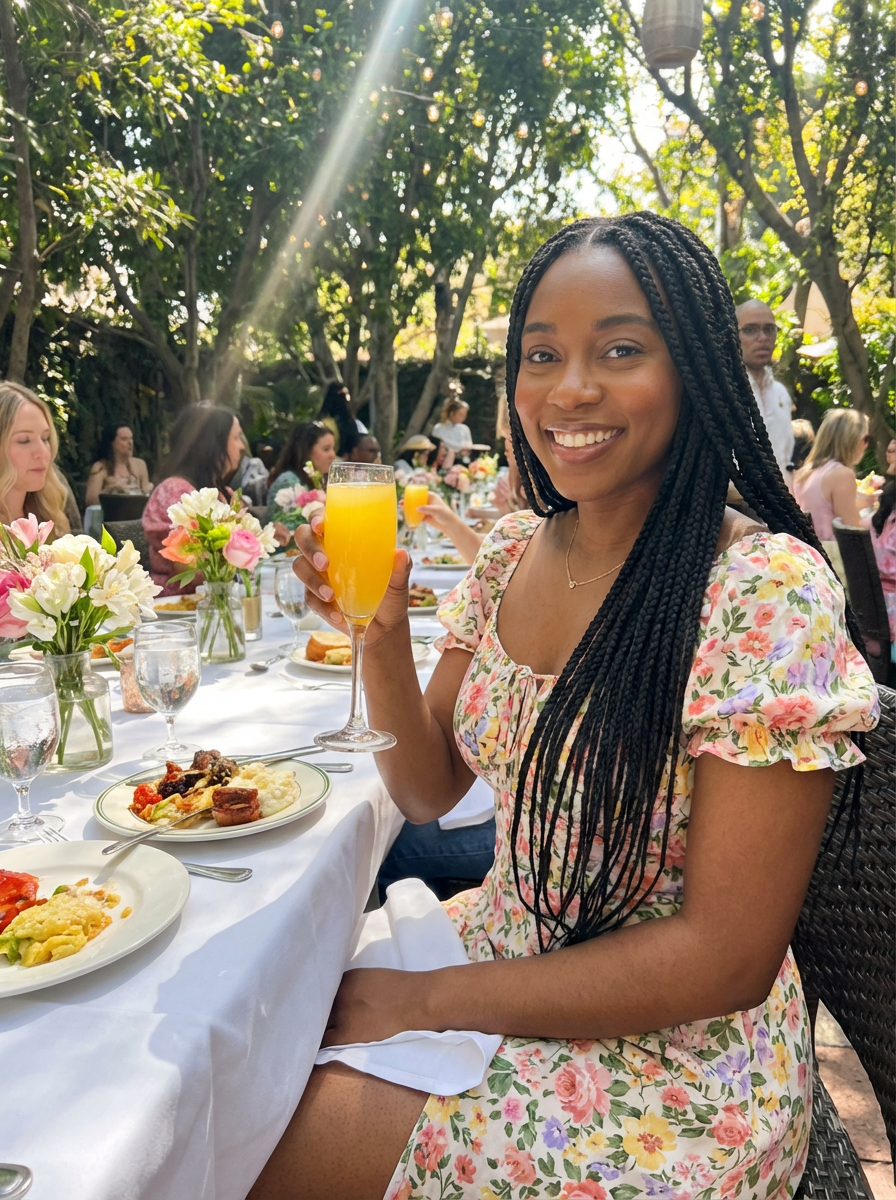 model at Mothers Day brunch, elegant table setting, spring outfit, mimosa toast, restaurant or garden setting