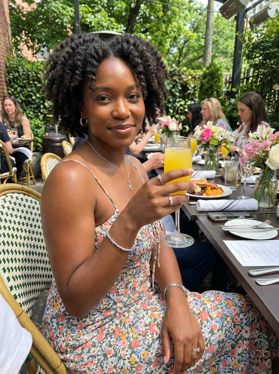 model at Mothers Day brunch, elegant table setting, spring outfit, mimosa toast, restaurant or garden setting