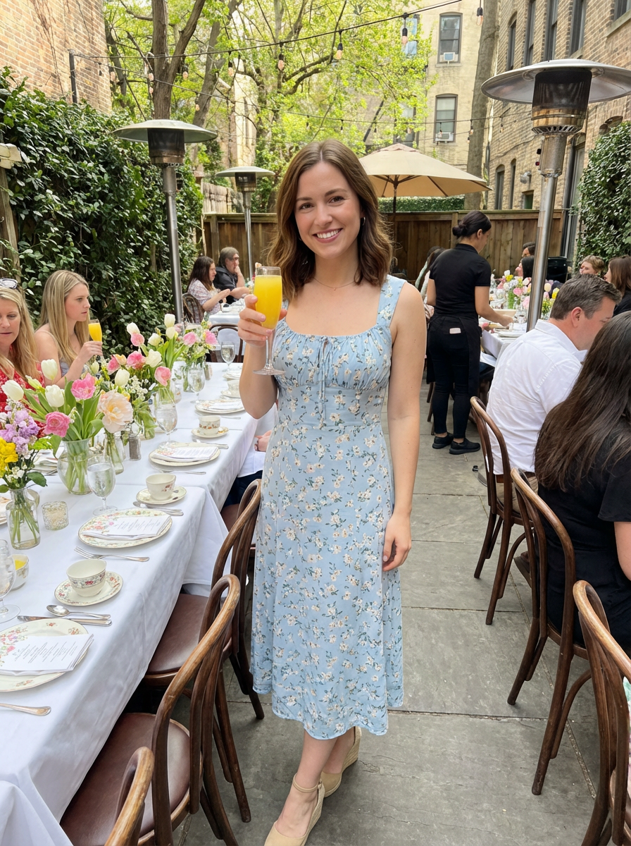 model at Mothers Day brunch, elegant table setting, spring outfit, mimosa toast, restaurant or garden setting