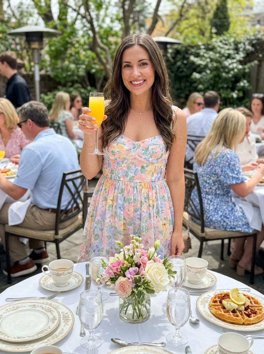 model at Mothers Day brunch, elegant table setting, spring outfit, mimosa toast, restaurant or garden setting