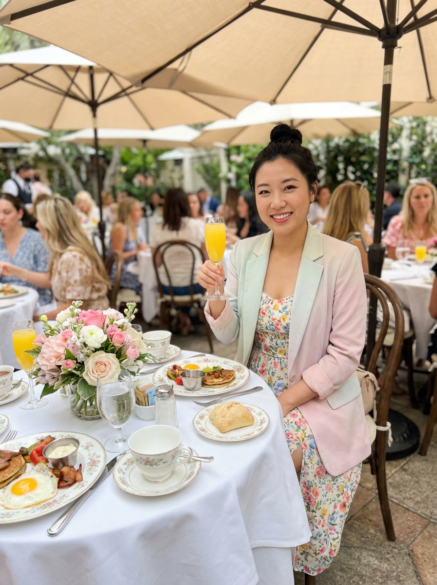 model at Mothers Day brunch, elegant table setting, spring outfit, mimosa toast, restaurant or garden setting