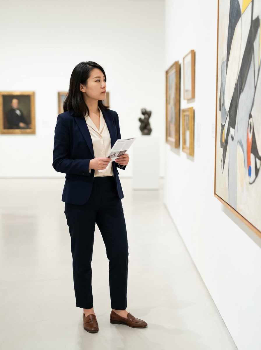 model at museum or gallery, cultured interests, smart casual attire, artistic background