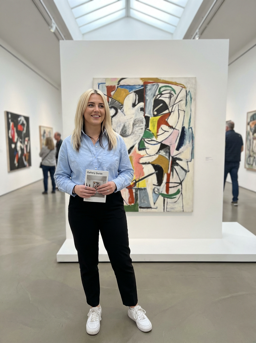 model at museum or gallery, cultured interests, smart casual attire, artistic background
