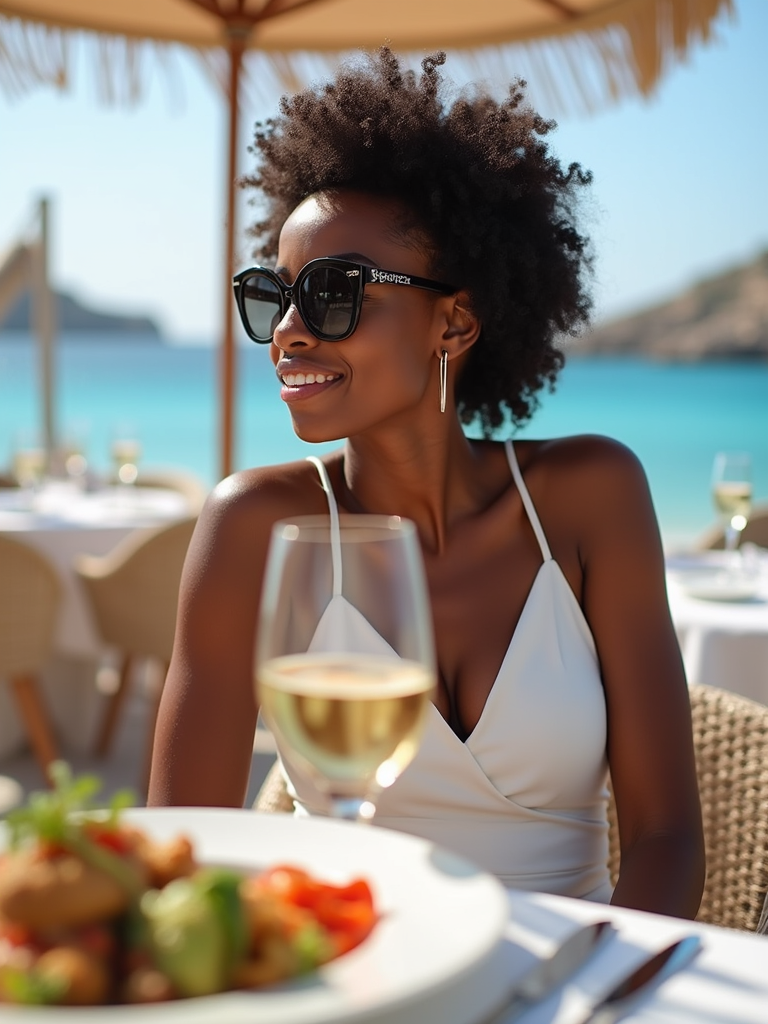 model at Nammos beach restaurant, wearing an elegant white sundress with designer sunglasses , champagne glasses and Mediterranean cuisine