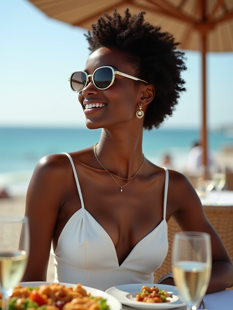 model at Nammos beach restaurant, wearing an elegant white sundress with designer sunglasses , champagne glasses and Mediterranean cuisine