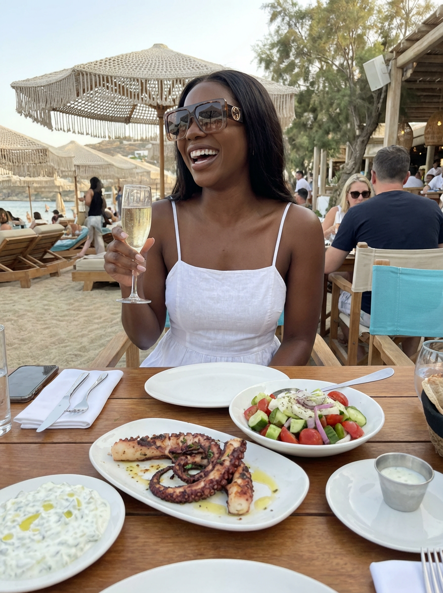 model at Nammos beach restaurant, wearing an elegant white sundress with designer sunglasses , champagne glasses and Mediterranean cuisine