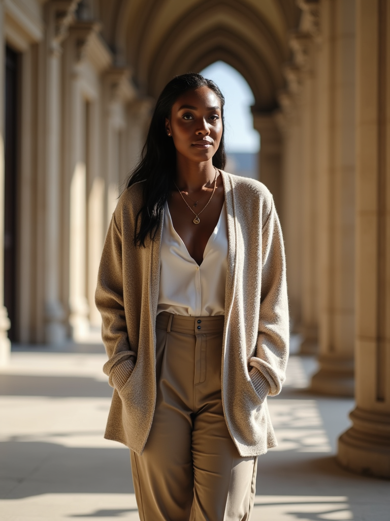 model at Notre-Dame Cathedral, wearing a respectful modest outfit with light cardigan , walking through historic architecture