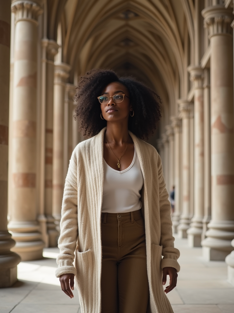 model at Notre-Dame Cathedral, wearing a respectful modest outfit with light cardigan , walking through historic architecture