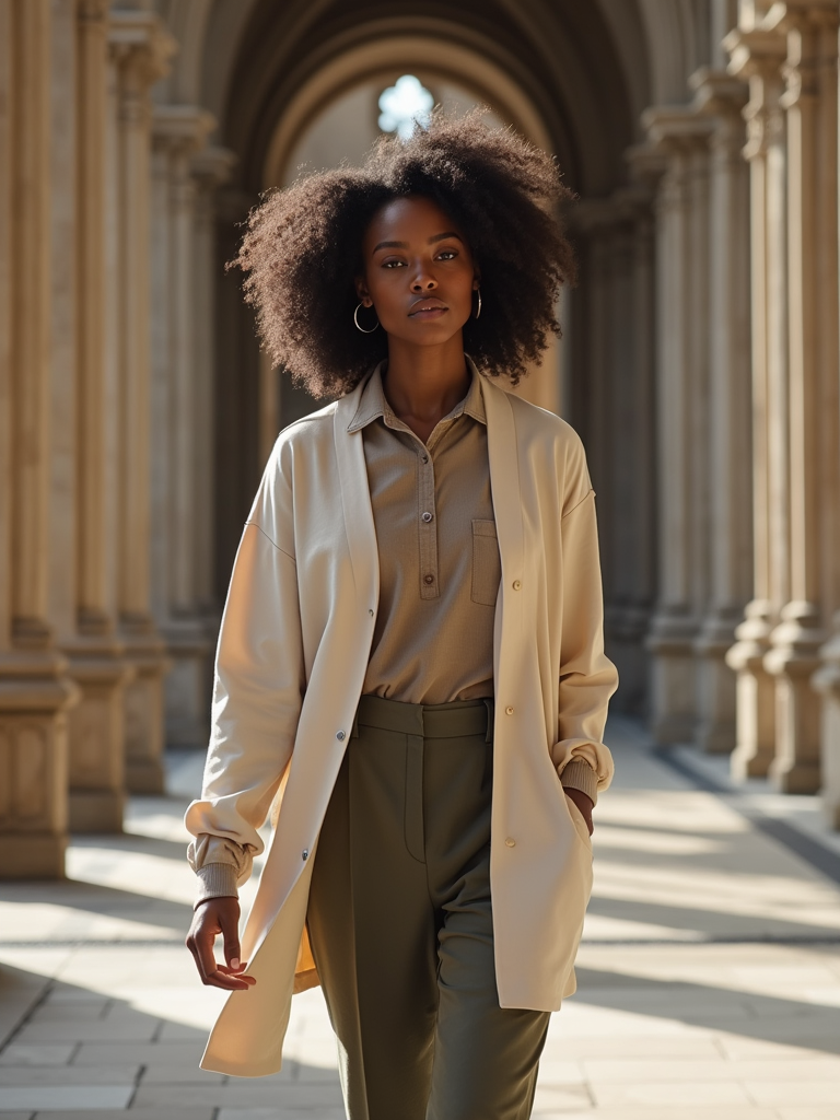 model at Notre-Dame Cathedral, wearing a respectful modest outfit with light cardigan , walking through historic architecture