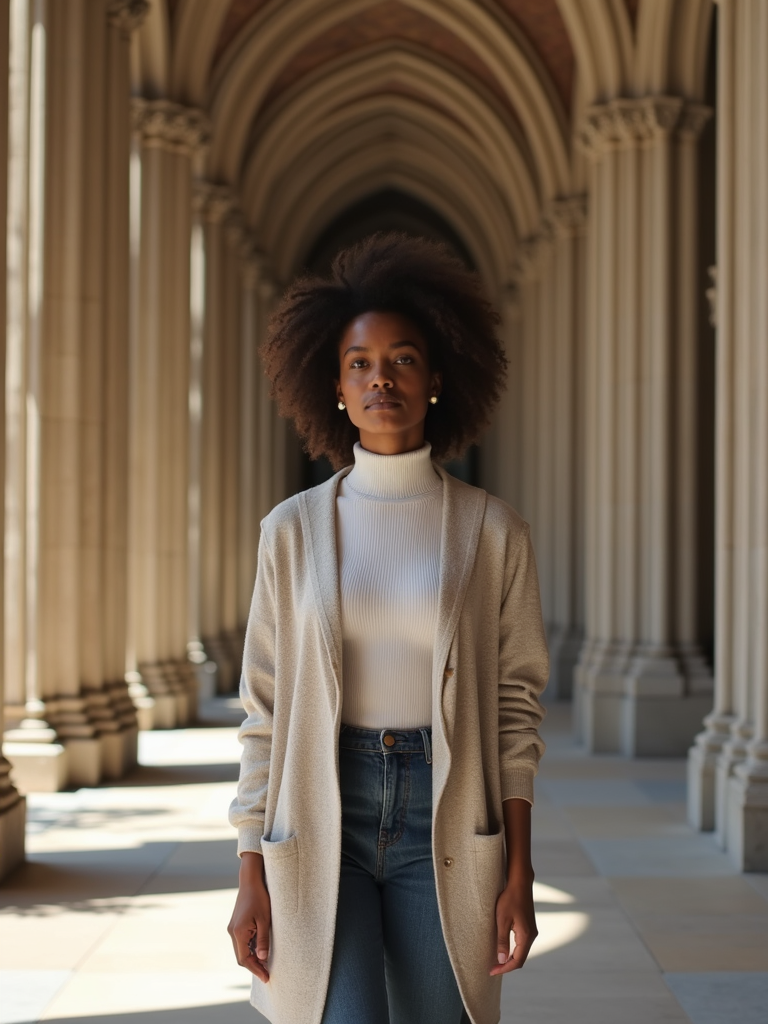 model at Notre-Dame Cathedral, wearing a respectful modest outfit with light cardigan , walking through historic architecture