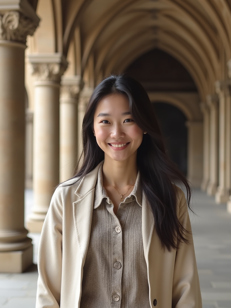 model at Notre-Dame Cathedral, wearing a respectful modest outfit with light cardigan , walking through historic architecture