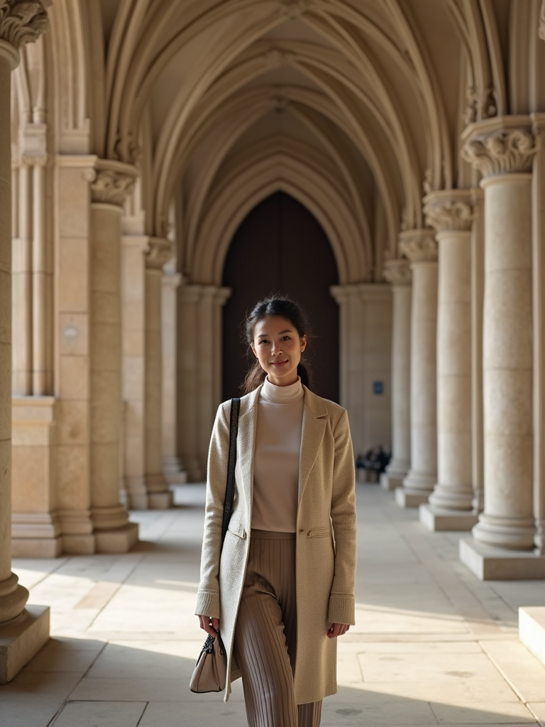 model at Notre-Dame Cathedral, wearing a respectful modest outfit with light cardigan , walking through historic architecture