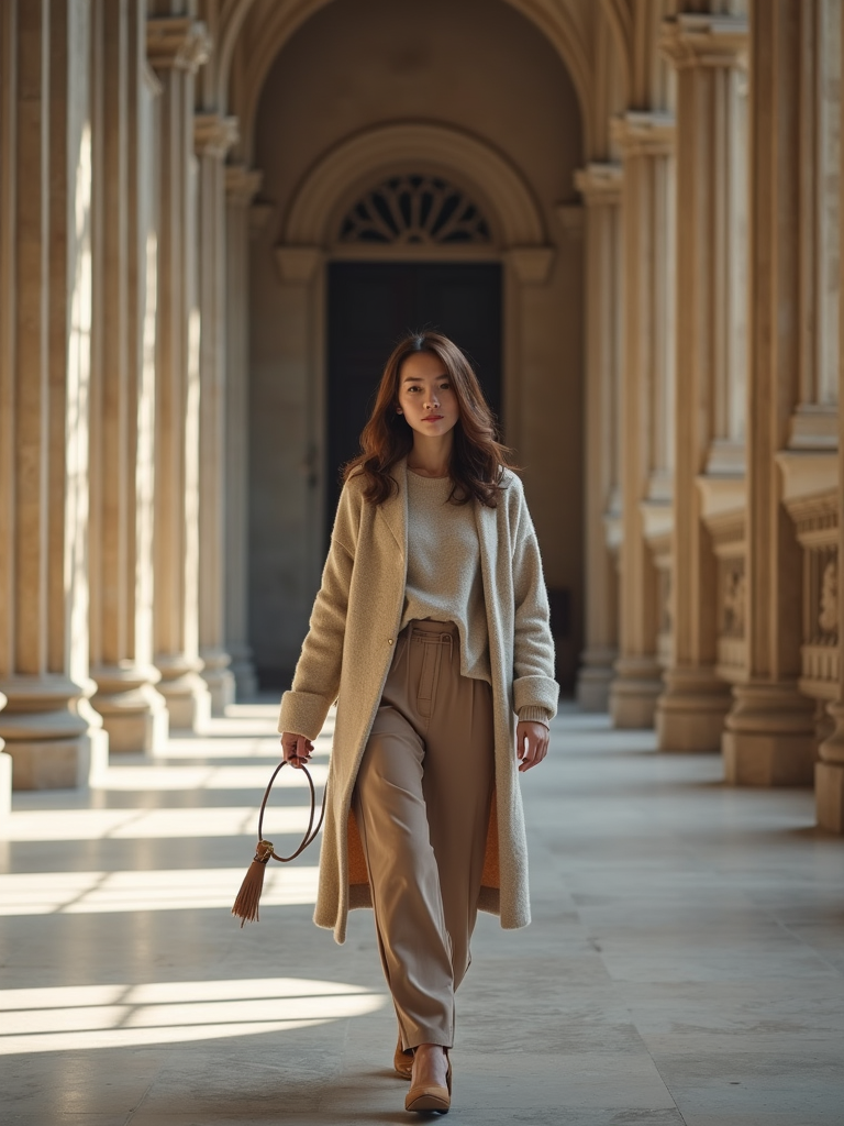 model at Notre-Dame Cathedral, wearing a respectful modest outfit with light cardigan , walking through historic architecture