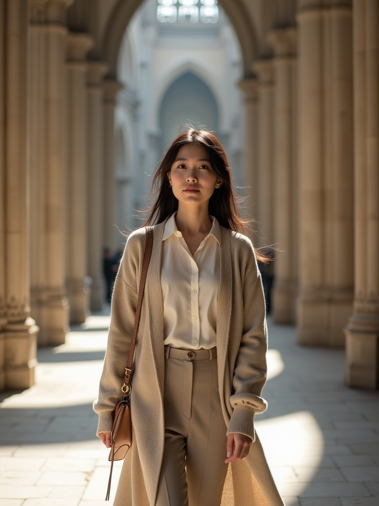 model at Notre-Dame Cathedral, wearing a respectful modest outfit with light cardigan , walking through historic architecture